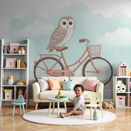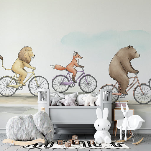KidsWallКачете се за забавно приключение с този тапет за деца, изобразяващ забавни животни на велосипед. Жираф, маймуна, лъв, лисица и мечка се движат весе...