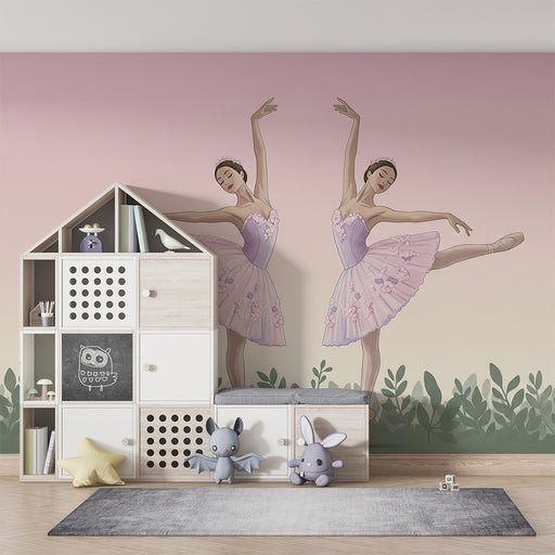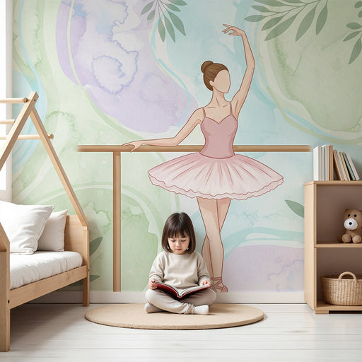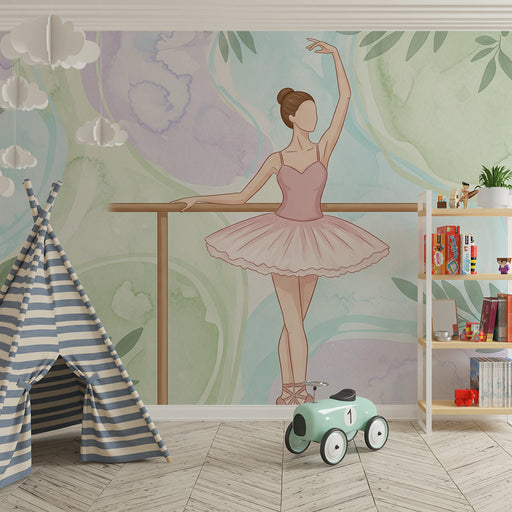 KidsWallПодарете на стаята на вашето дете малко магия с този тапет за деца, изобразяващ грациозна звездна танцьорка, обградена от нежни листа. Пастелната ц...