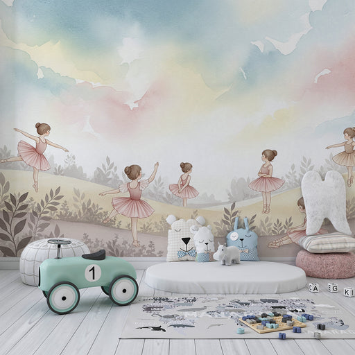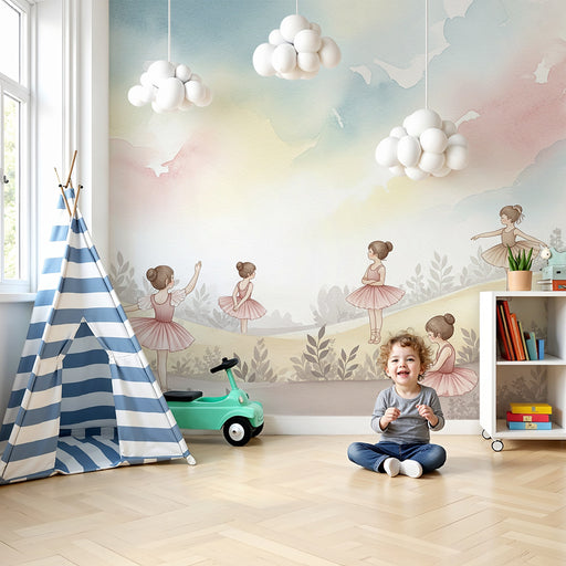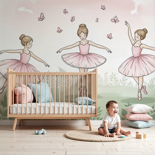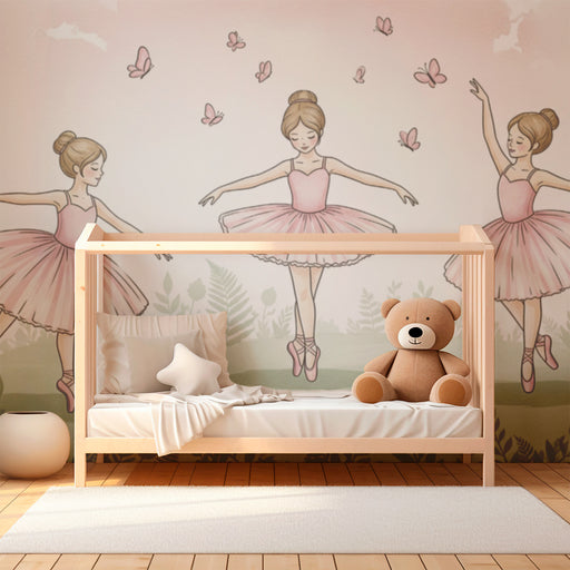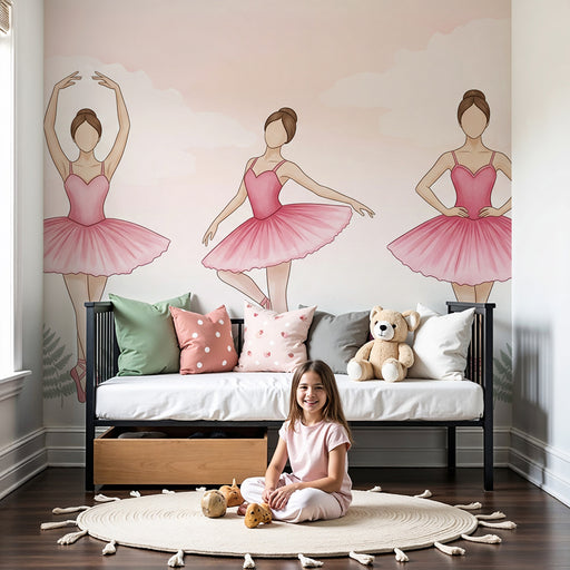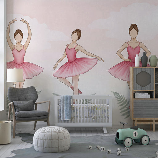 KidsWallВнесете магията на танца в стаята на вашето дете с този очарователен детски тапет. Три млади балерини изпълнително се издигат, облечени в розови тю...