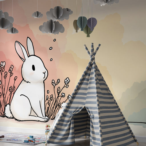 KidsWallПревърнете стаята на вашия бебе в мечтателски свят с този тапет за бебе, изобразяващ сладък заек, седящ спокойно сред розови облаци. Нежната светли...
