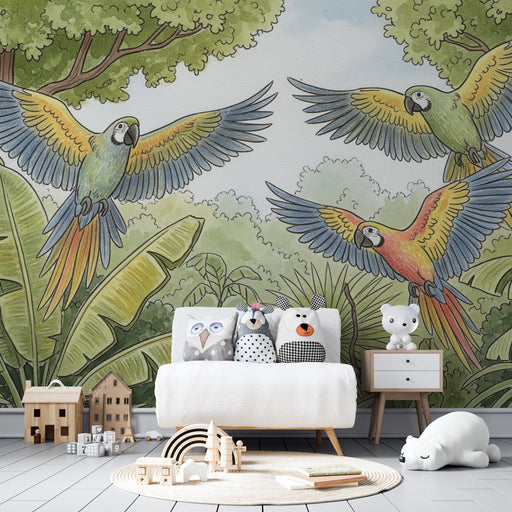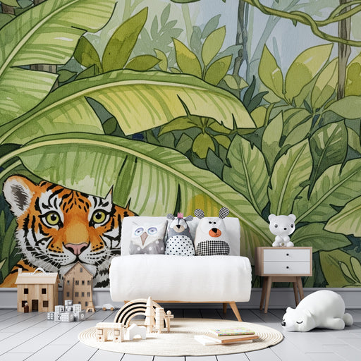 Този тапет за бебешка стая залага на топли и динамични цветове: дълбоки зелени, които напомнят богатството на тропическата растителност, оранжеви и златисти тонове, които напомнят за топлината на слънцето, пречупващо се през листата. Всеки детайл, от бананови дървета до ярки цветя, е внимателно илюстриран, за да създаде поглъщаща и жива атмосфера, идеална за събуждане на любопитството и въображението на децата.