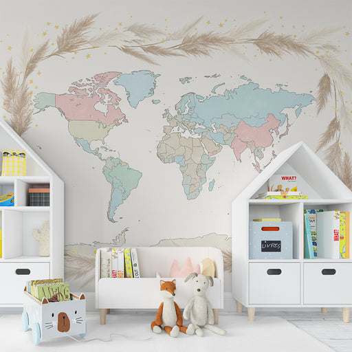Подарете на вашето дете декор, който стимулира неговото въображение и го съпровожда в съня му. Този тапет карта на света преобразява пространството му в магическо убежище, където може да измисля истории и да пътува по света, без да напуска леглото си. Комбинирайте го с елементи от естествено дърво, светлинни гирлянди и текстили в меки цветове, за да подчертаете тази нощна и успокояваща атмосфера. Ъгъл за четене под звездно небе, мек килим за мечти за далечни приключения... Всеки детайл допринася за създаването на уникална и очарователна атмосфера.