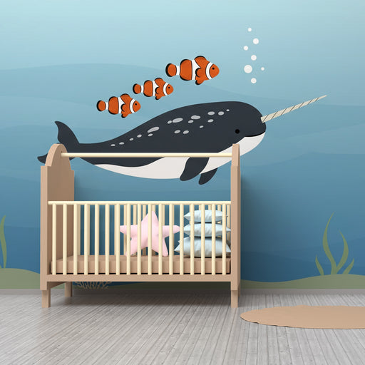 Показване на всички подробностиPapel de parede quarto bebê | Нарвал и подводни клоуни риби