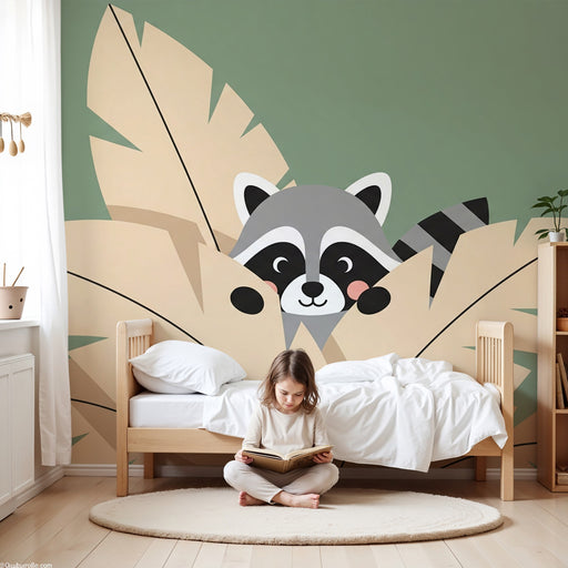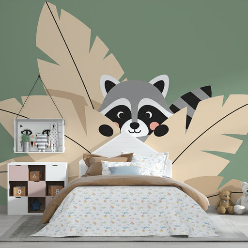 KidsWallДонесете допир на нежност и забавление в стаята на вашия бебе с този оригинален детски тапет, изобразяващ прелестен енот, скрит сред големи тропиче...