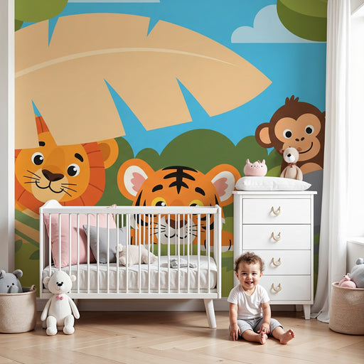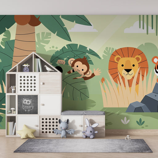 KidsWallВпуснете се във вибриращия свят на джунглата с този тапет за деца, който представя прелестни и забавни животни в тропическа обстановка. Усмихнат лъ...