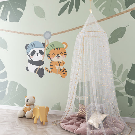 KidsWallДобавете малко магия в стаята на вашето дете с този тапет за деца, изобразяващ панда и лисица, весело се качващи на люлки. Под голямо дърво с нежни...