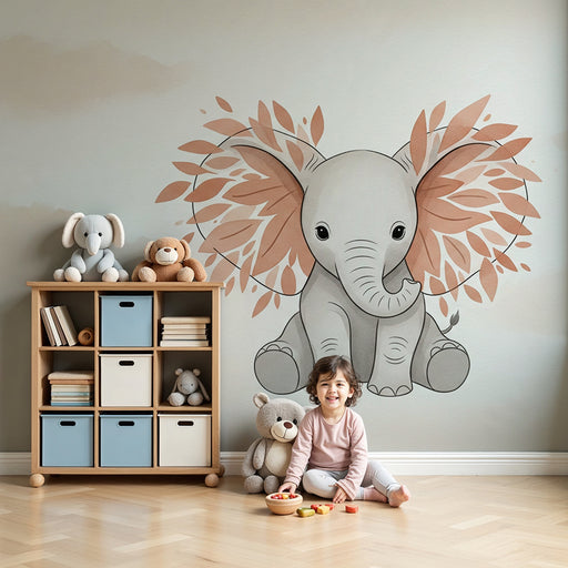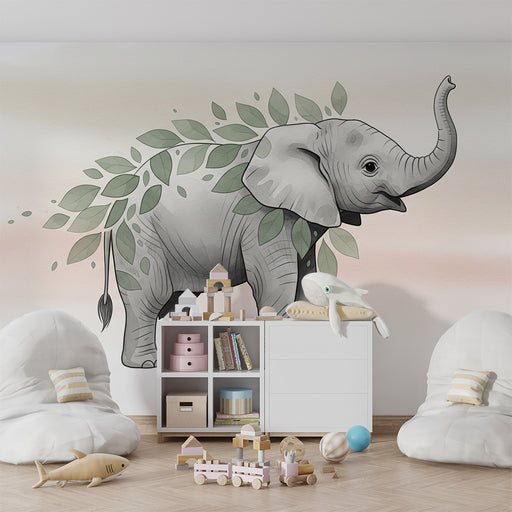 KidsWallПревърнете стаята на вашия бебе в свят на нежност с този тапет за бебе, представящ очарователен слон с деликатни листа. Този успокояващ дизайн създ...