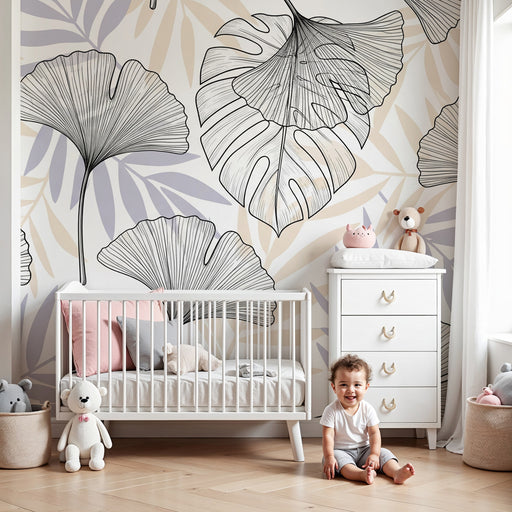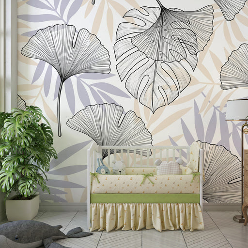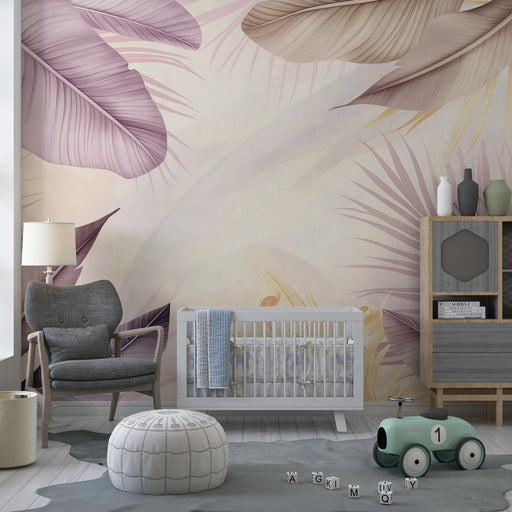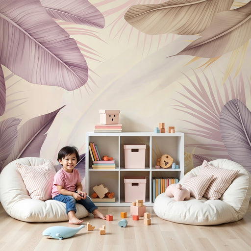 KidsWallПреустройте стаята на вашето дете с тапети с деликатни тропически листни мотиви. Всяко листо, боядисано в нежни лилави и бежови нюанси, създава усм...