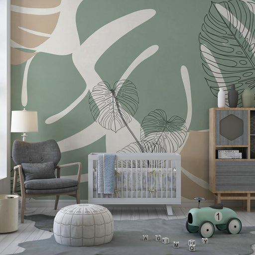 Показване на всички подробностиPapel de parede criança | Folhas tropicais bege e verde sálvia