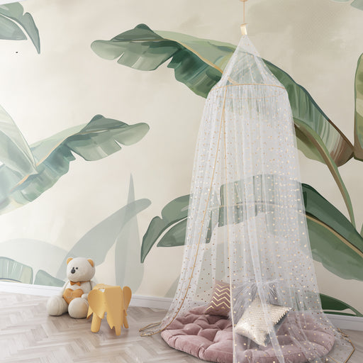 KidsWallПреобразете стаята на вашето дете с този тапет за деца, вдъхновен от тропическите пейзажи. Изящно изрязани луксозни палмови листа се отличават на н...