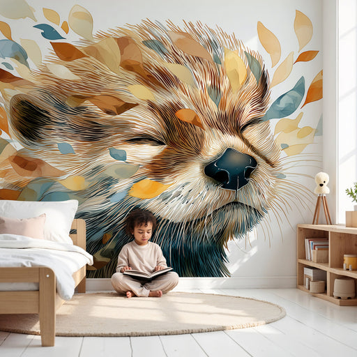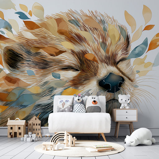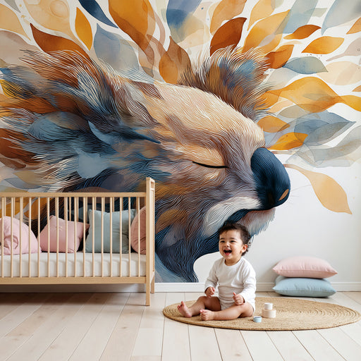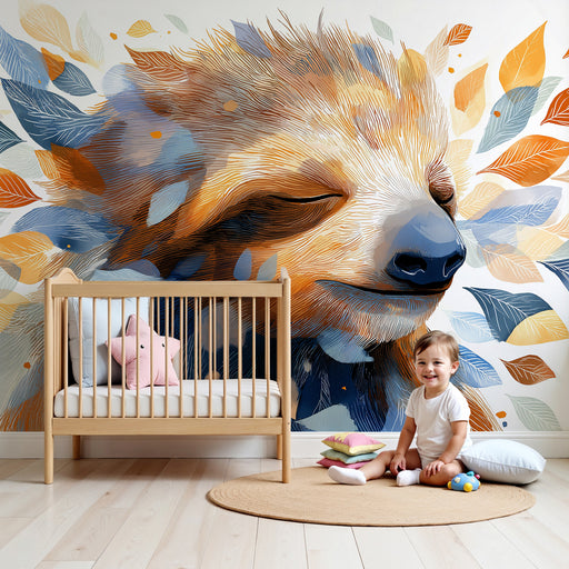KidsWallПотопете се в мек и успокояващ свят с този тапет за деца, изобразяващ сладко малко животно, спящо нежно обгърнато от цветни листа. Творбата използв...