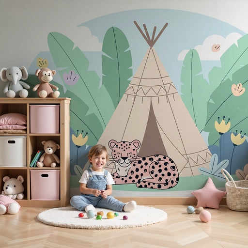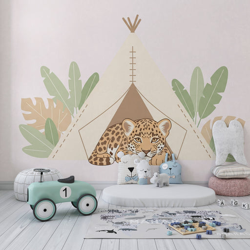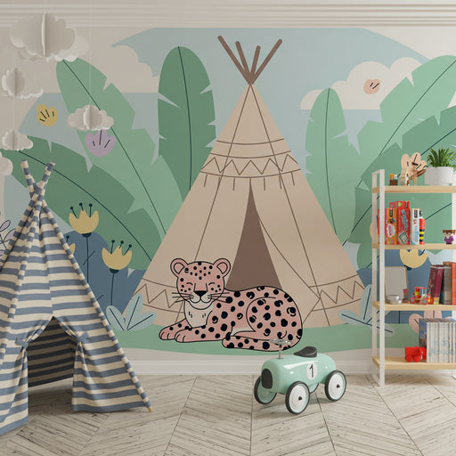 KidsWallПреустройте стаята на вашето дете с тази тапет за деца, представящ очарователен палатка сред тропически декор. Един спокоен малък леопард лежи, доб...