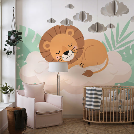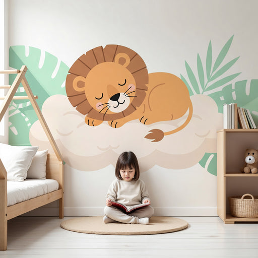 KidsWallСъздайте мек и уютен свят за вашия малък с този тапет за деца, представящ спящ лъв на пухкав облак. Заобиколен от нежни тропически листа, този лъв ...