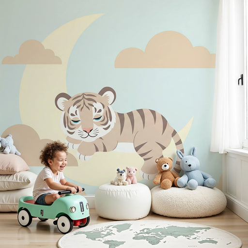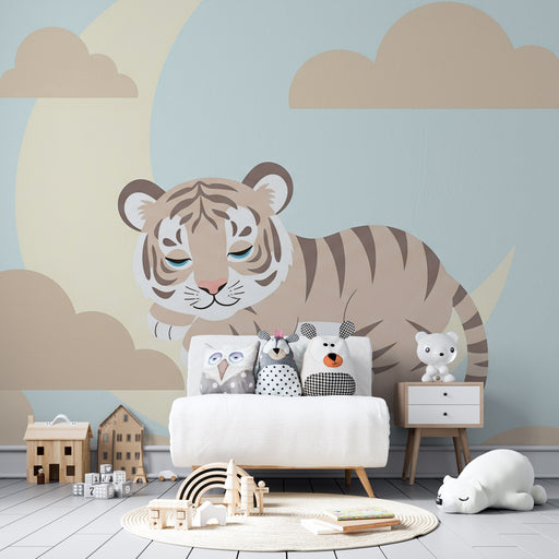 KidsWallДобавете малко магия в стаята на вашето дете с тази тапет за деца, изобразяващ сладък малък тигър, спокойно поставен на полумесец. Обкръжен от меки...