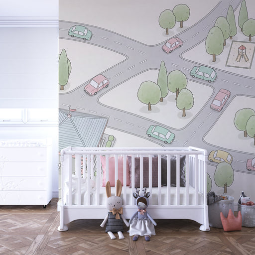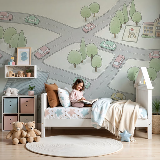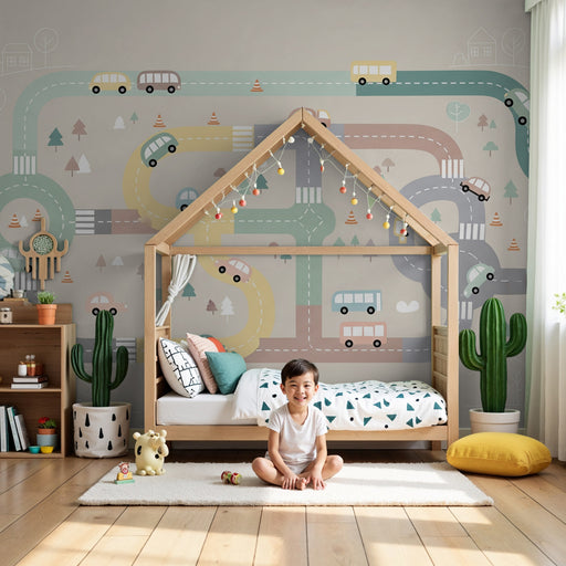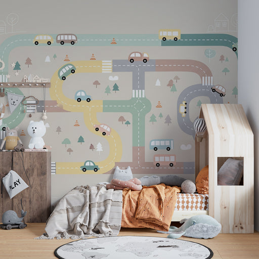 KidsWallПревърнете стаята на вашето дете в свят на приключения с този детски тапет, изобразяващ забавен път. Цветни превозни средства като коли и автобуси ...