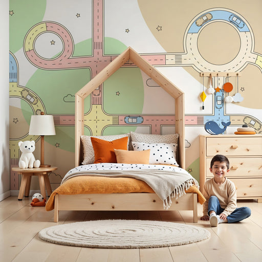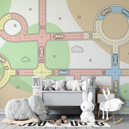 KidsWallПревърнете стаята на вашето дете в истинска автомобилна писта с тази тапети за деца, илюстрираща цветни пътища и забавни коли. Този игрив и динамич...