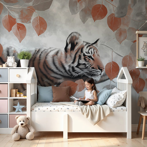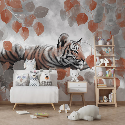 KidsWallПревърнете стаята на вашето дете в екзотично убежище с този тапет за деца, илюстриращ мажестатичен тигър, почиващ сред нежно листва. Контрастът меж...
