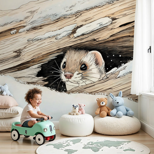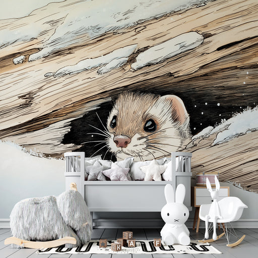 KidsWallОткрийте магията на зимата с тапет за деца, изобразяващ очарователен кунец, който излиза от своята гнезда под кората. Зимният пейзаж с мекия сняг и...