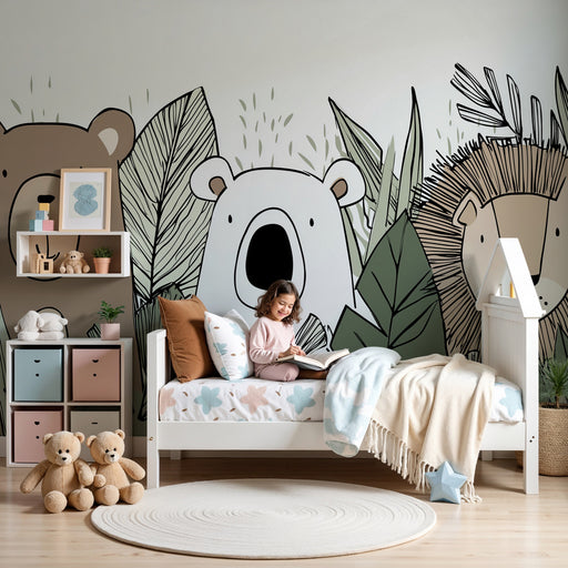KidsWallПогледнете в очарователен свят с този тапет за детска стая, в който участват обичайни животни от гората. Сред деликатни зелени листа, усмихнат мечо...