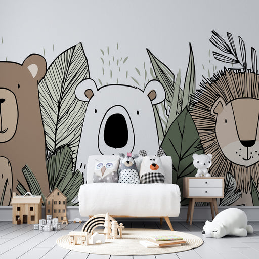 KidsWallПодкрепете вълнението и приключението в стаята на вашето дете с този тапет за деца, изобразяващ джунглени животни. Сред обилието на листа, мечка с ...