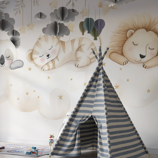 KidsWallПреустройте стаята на вашето дете с тапет за деца, изобразяващ сладки животни, които спят спокойно на облак. Панда, тигър и лъв с нежни черти и спо...