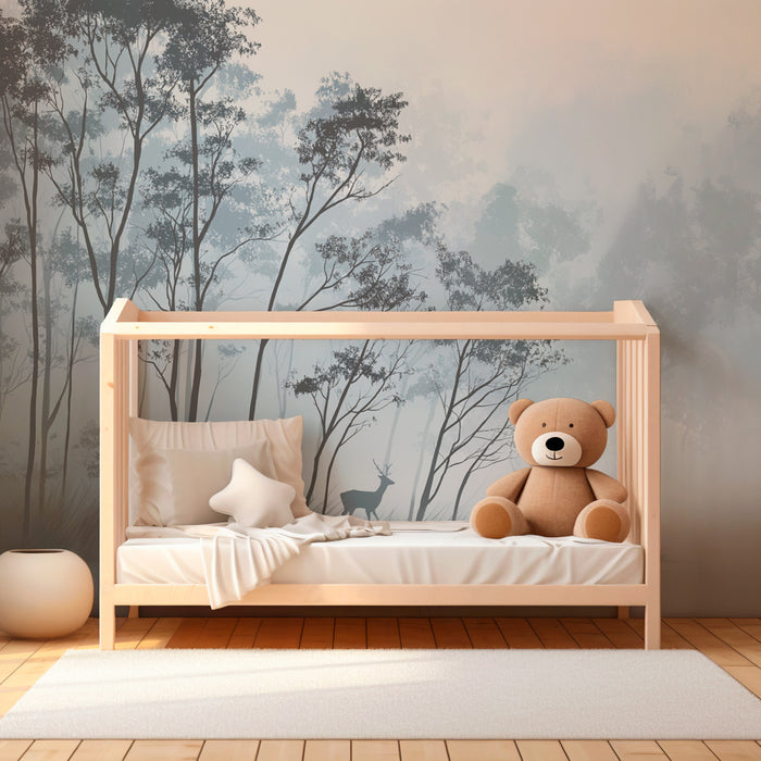 Превърнете стаята на вашето дете в успокояващ свят с тази детска тапети, изобразяваща мъгливата гора, в която се разхождат нежни еленчета. Елегантните силуети на дърветата се очертават в нежни сини тонове, създавайки магична и спокойна атмосфера. Декор, който кани на мечтателство и изследване на природата.