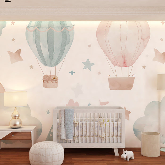 Този тапет за деца се отличава със своите нюанси на пудрено розово, небесно синьо и мек бежов, които придават усещане за лекота и спокойствие. Пухкавите облаци се смесват с блестящите звезди, докато планините със заснежени върхове дискретно изплуват, добавяйки нотка магия. Деликатно украсените балони, с техните приветливи кошници, сякаш носят мечтите към нови хоризонти. Целият дизайн, вдъхновен от акварела, дава усещане за плавност и поезия, идеален за детски свят, изпълнен с мекота.
