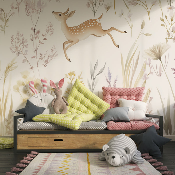 Тапет за детска стая | Подскачащ елен и пастелни цветя