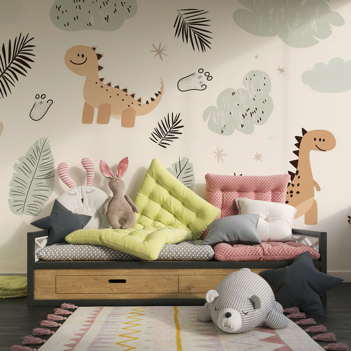Мотивът представя сладки динозаври в бежови и кафяви тонове, разпръснати сред леки тропически листа, звезди и малки отпечатъци, придавайки на цялото деликатно текстуриран ефект. Естествените и нежни цветове, вариращи от градински зелен до мек пясъчен, създават успокояваща визуална хармония, идеална за уютен и комфортен свят.