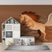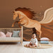 Открийте нашия тапет с див кон в земни тонове, идеален за стаята на вашето дете. Този завладяващ дизайн представя величествено кон да галопира през плавен пейзаж от кафяви и охрови тонове, създавайки топла и вдъхновяваща атмосфера.