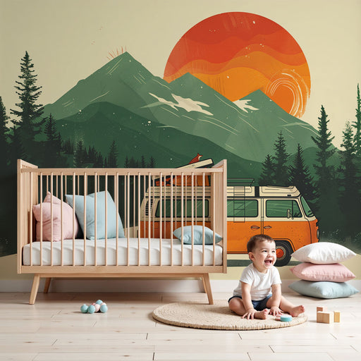 Тапет за детска стая | Ретро приключение в планината с оранжев ван и залез