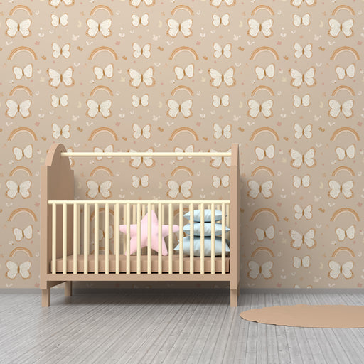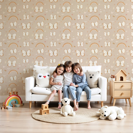 KidsWallПревърнете стаята на вашето дете в оазис на мира с този тапет за детска стая, украсен с красиви пеперуди. Този нежен и светъл десен в бежово доприн...