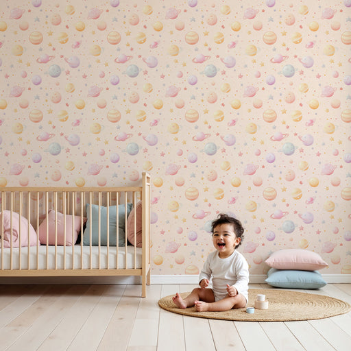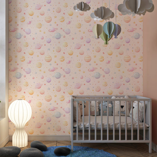 KidsWallПогледнете в свят на нежността с този тапет за детска стая, илюстриращ пастелен свят, пълен с планети и звезди. С нежни тонове на розово, жълто и с...