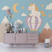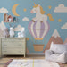 Погледнете детето си в свят на мечти и фантазии с този тапет за детска стая, илюстриращ очарователен еднорог, пътуващ в горещ въздушен балон. Висящ над нежни и оцветени планински пейзажи, еднорогът изглежда, че се наслаждава на всеки момент, като се движи сред облаците и блестящите звезди.