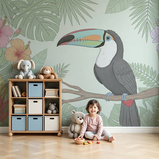 Papel de parede criança com padrões | Trópicos animados com tucanos coloridos
