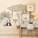 Вървете се в забавен и уютен свят с тази тапет за бебе, изобразяващ джунгла пълна с живот. Мило панда седи спокойно под палма, докато жираф и маймуна се забавляват сред дърветата. Този вълшебен декор превръща стаята в истински убежище на приключения и нежност.