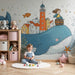 Добавете допир на магия и приключение в стаята на вашето дете с нашата тапет с китове. Тази деликатна илюстрация изобразява голямо синьо кито, който носи весело дете през цветно крайбрежно селище. Червен фар, риби и звезди допълват този очарователен морски тематичен дизайн.