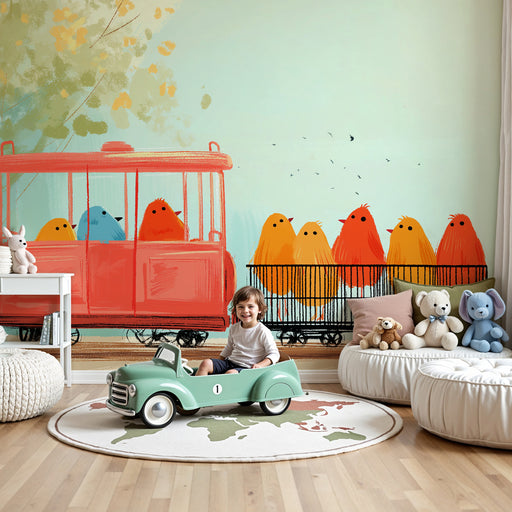 KidsWallTransformez la chambre de votre enfant en un monde vibrant et joyeux avec ce papier peint pour enfants illustrant un charmant train rempli d'oiseau...