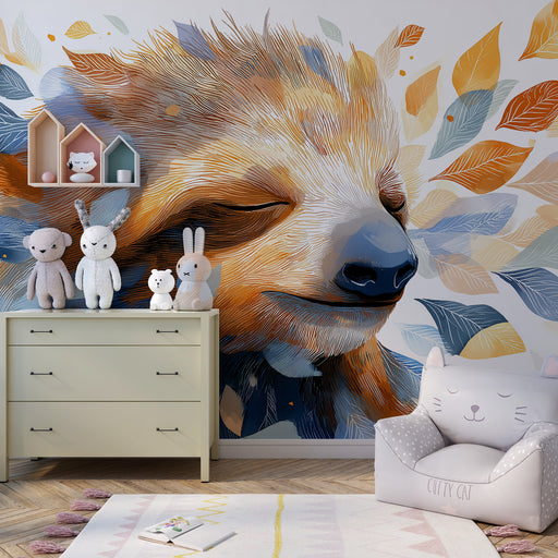 KidsWallTransformez la chambre de votre enfant avec ce papier peint pour enfants représentant un paresseux serein, entouré de feuilles aux couleurs chaleur...