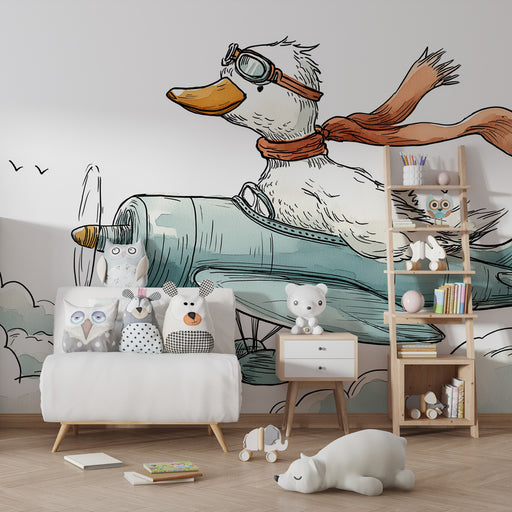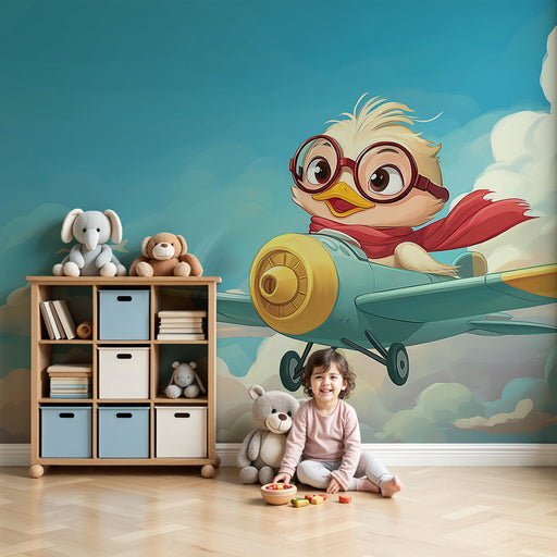 KidsWallEmbarquez pour des aventures célestes avec ce papier peint pour enfants mettant en scène un ours pilote sur un avion rose. Flottant dans un ciel ét...