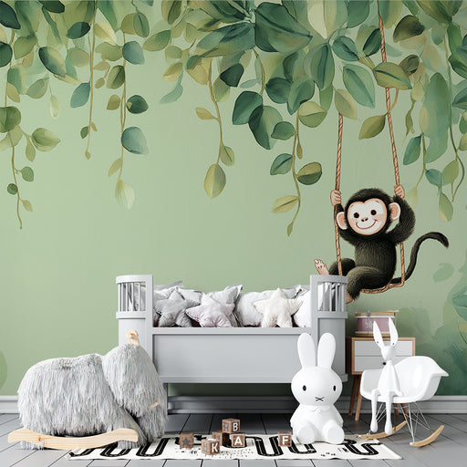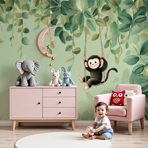 Afficher tous les détailsPapier peint chambre bébé | Singe joyeux sur balançoire entouré de feuillage luxuriant
