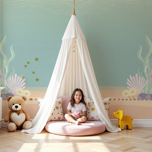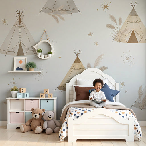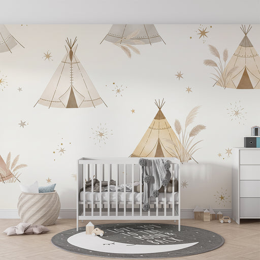 KidsWallTransformez la chambre de votre bébé en un espace enchanteur avec ce papier peint pour bébé illustrant des tipis délicats entourés d'étoiles scinti...
