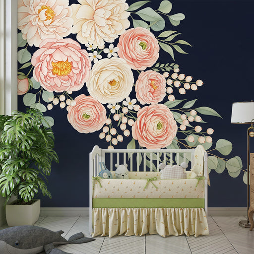 Papier peint chambre bébé | Tombée de fleurs délicates sur fond bleu nuit