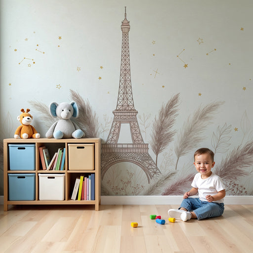 Une fois le mur posé, un rideau en gaze de coton, une lampe boule opaline et deux étagères basses suffisent souvent. Évitez de multiplier guirlandes et figurines autour du décor principal : laissez le motif respirer et choisissez une matière dominante (bois clair, métal blanc, cannage) pour lier l’ensemble. Nous aimons terminer par un cadre photo discret, pris au ras du motif, comme un clin d’œil à l’histoire qu’il raconte.
