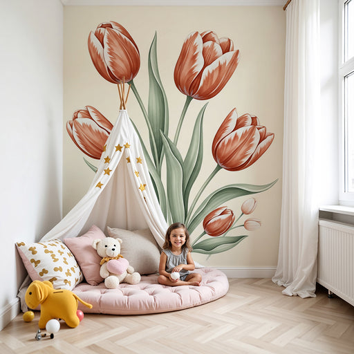 KidsWallAjoutez une touche de joie à la chambre de votre enfant avec ce papier peint moutons, illustrant trois moutons sautillants au milieu de tulipes col...