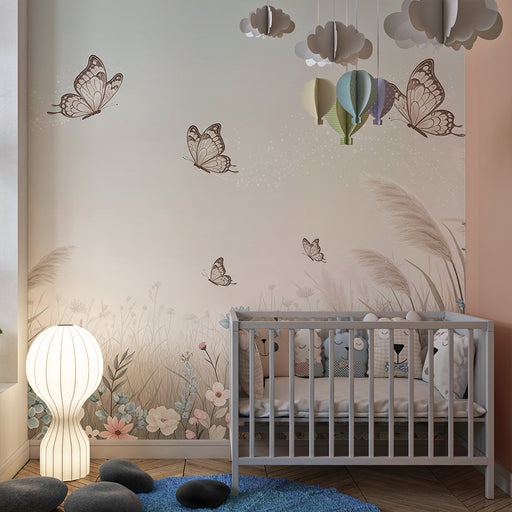 Afficher tous les détailsPapier peint chambre bébé | Un jardin fleuri avec des papillons dans des tons doux
