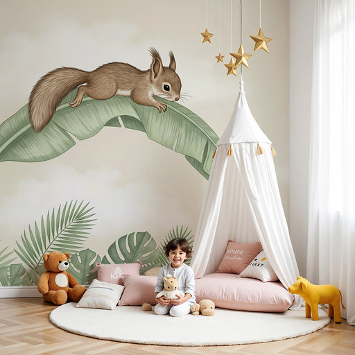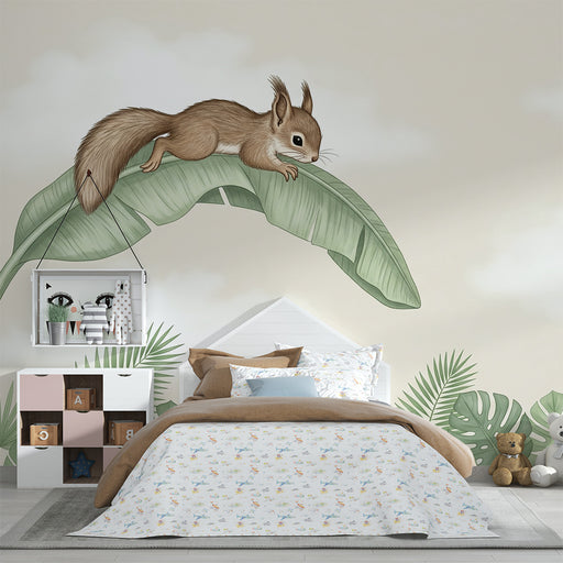 Afficher tous les détailsPapier peint chambre bébé | Écureuil curieux sur une feuille tropicale