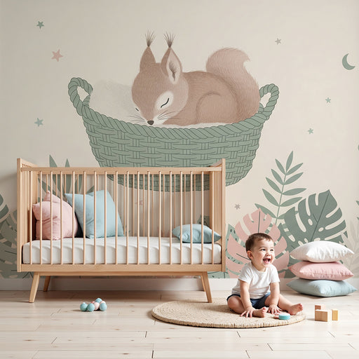 Afficher tous les détailsPapier peint chambre bébé | Écureuil endormi dans son panier