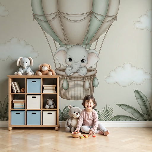 KidsWallEmbarquez pour une aventure aérienne avec ce papier peint pour bébé mettant en scène un adorable éléphant flottant dans une montgolfière. Ce décor ...