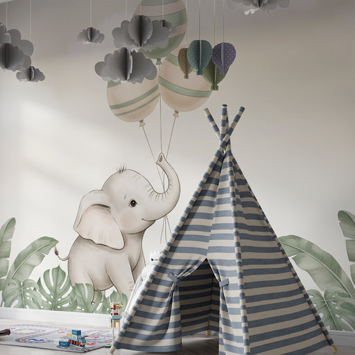 KidsWallTransformez la chambre de votre bébé en un espace enchanteur avec ce papier peint pour bébé mettant en scène un adorable éléphant tenant des ballon...